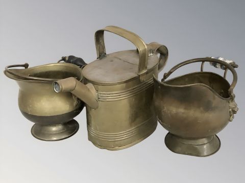A brass watering can, height 23 cm, and two miniature coal helmets.