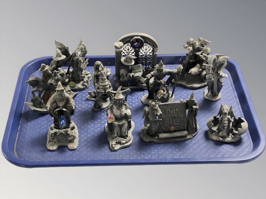 A group of pewter Dungeons & Dragons fantasy figures.