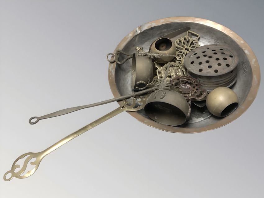 A copper pan together with other brass ware, roasting pan, horse brass, etc.