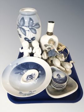 A group of Royal Copenhagen and similar ceramics including dishes, lamp base, figures, etc.