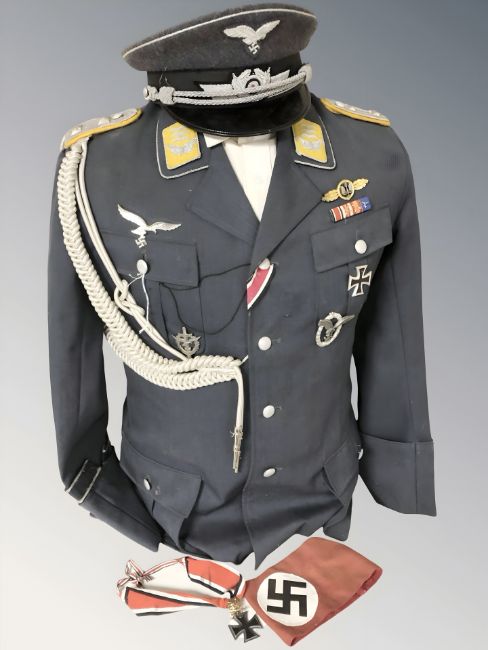 A reproduction German Luftwaffe tunic, cap, arm band, etc.