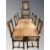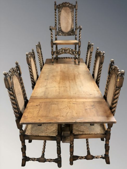 A reproduction oak pull out extending refectory dining table on carved bulbous supports, extended 244 cm x 87 cm x 76 cm, together with a set of seven oak barley twist cane backed dining chairs, comprising of six singles and one carver armchair.