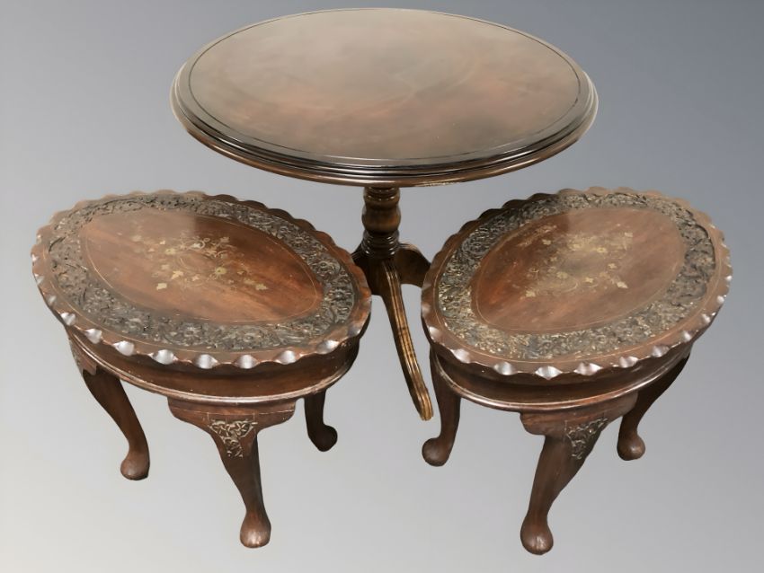 A reproduction circular occasional table and pair of brass eastern oval tables