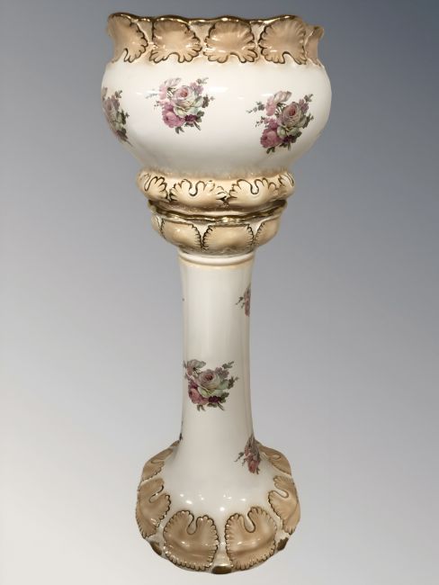 A transfer printed pottery jardiniere on stand, height 78 cm