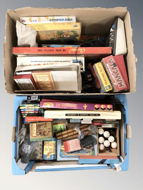 Assorted board games, playing cards, toys etc (2 boxes)