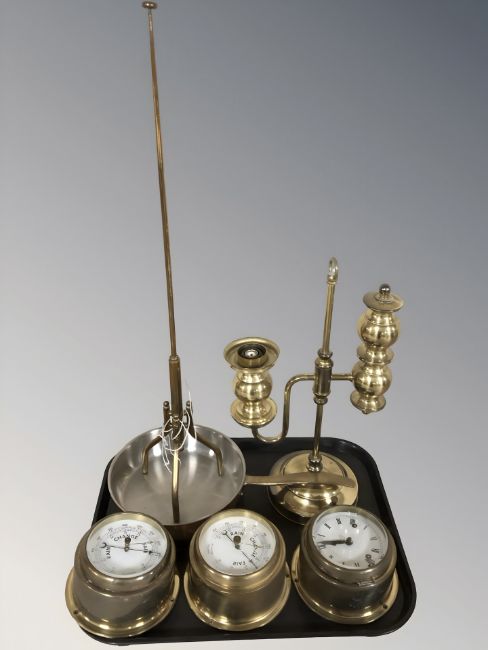 Two brass cased ship's barometers, further timepiece, brass handled frying pan and further items.