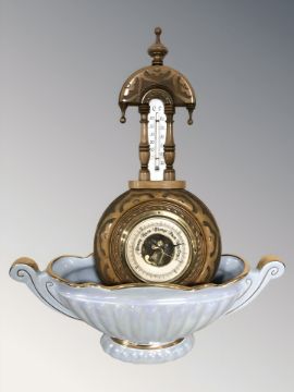 A carved beech barometer and a Sadler lustre twin handled centrepiece.