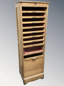 An early 20th century oak tambour front pedestal filing cabinet, 50 cm W x 40 cm D x 156 cm H.