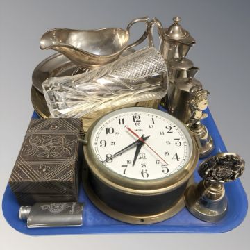 A Smiths brass cased quartz ship's timepiece, further brass plates, EPNS wares, a small hip flask, carved wooden trinket box, etc.