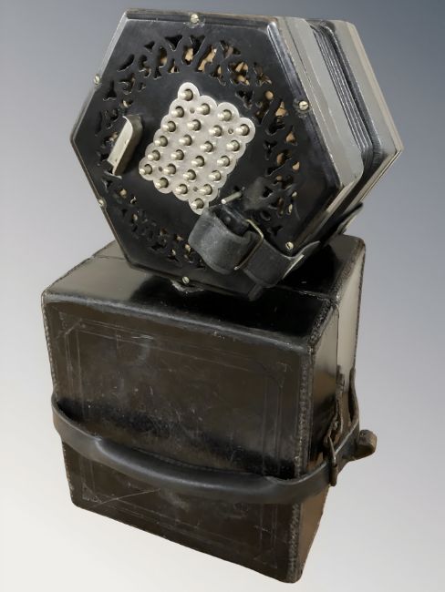An early 20th century twenty four button concertina, with ebony fret work end pieces and black leather bellows, missing makers label, in Lachenal & Co. box.