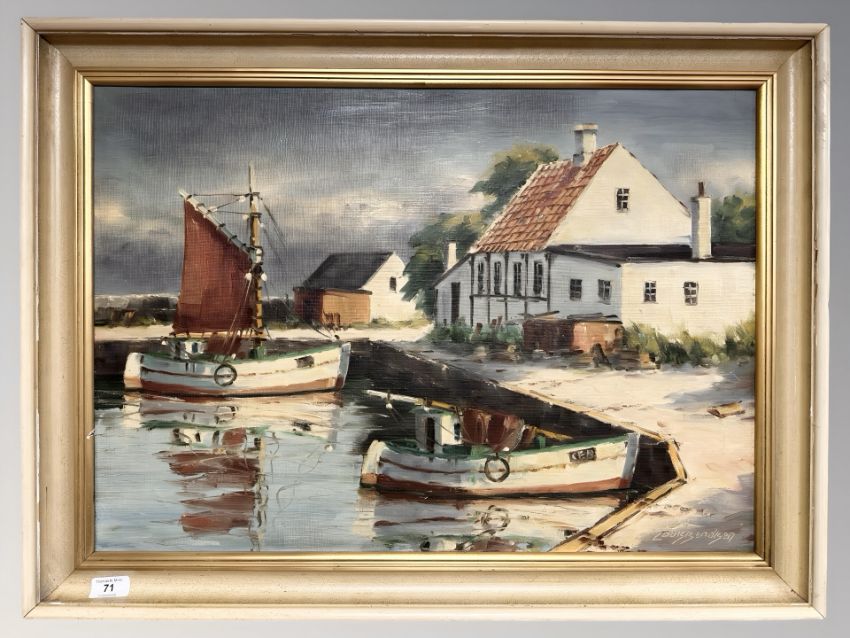 Louis Bendsen : Fishing boats in a dock, oil on canvas, 67 cm x 47 cm.