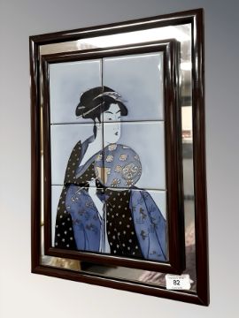 A tiled mosaic depicting a geisha, mounted on a mirrored panel, 34 cm x 45 cm.