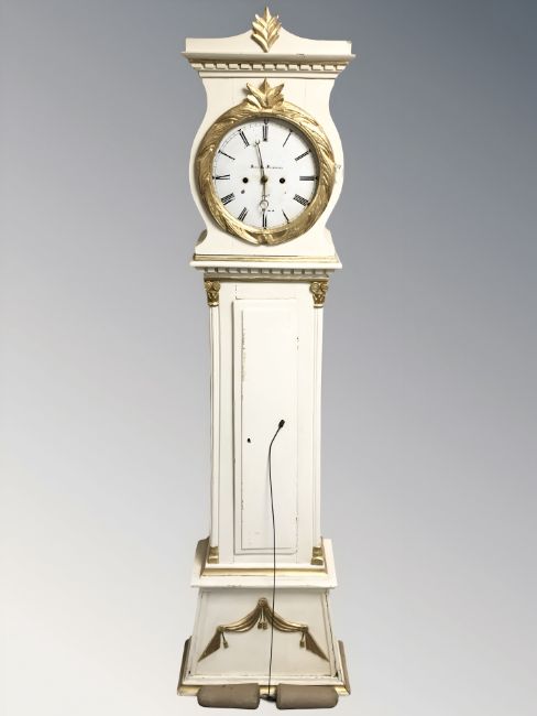 A 19th century Continental painted and gilt longcased clock, pendulum and two weights, height 200 cm