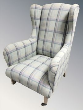 A modern wingback armchair in tartan fabric, width 76 cm.