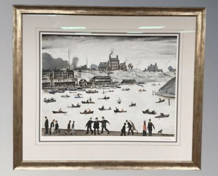 After Laurence Stephen Lowry R.A. (British, 1887-1976) : Crime Lake, reproduction in colours, signed in pencil, with the blindstamp of The Fine Art Trade Guild, 43 cm x 57 cm, framed. Subject to Artist's Resale Rights additional premium.