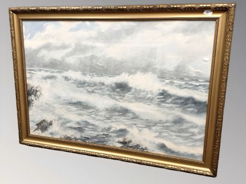 R Thompson Lambert : Waves crashing on rocks, watercolour, 110 cm x 75 cm.