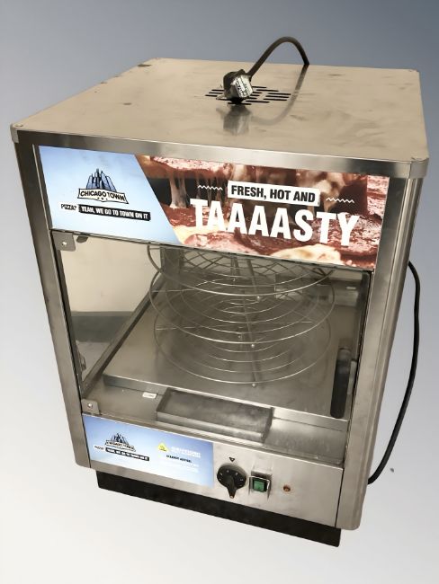 A commercial stainless steel pizza warming cabinet, width 56 cm.