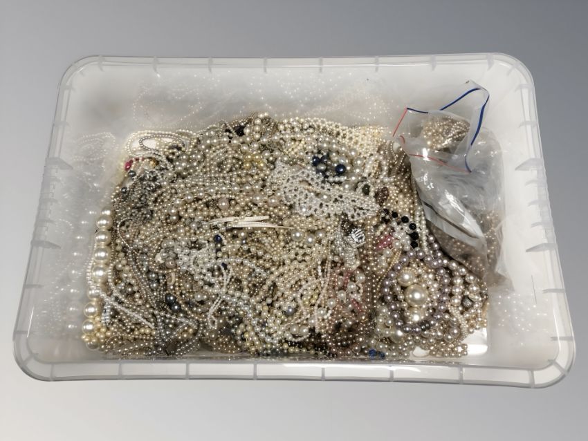 A large quantity of simulated pearl jewellery. (1 box)