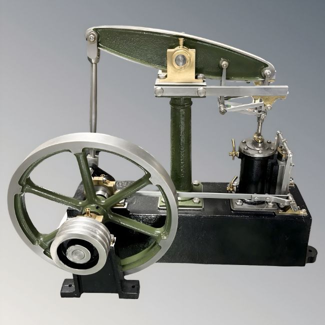 A Stuart live steam piston engine, 35 cm L x 18 cm W x 29 cm H.