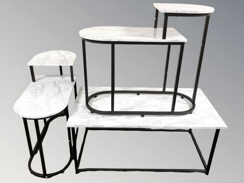 A group of faux marble topped tables