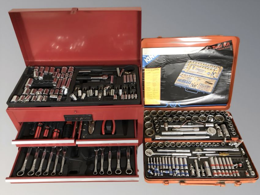 A Dynamic enameled tool chest containing sockets, spanners, etc, and a further enameled case containing a 135 piece socket set.