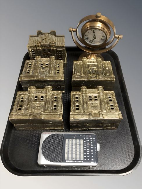 Four brass county bank money banks, a Roberts mini radio and a desk clock.