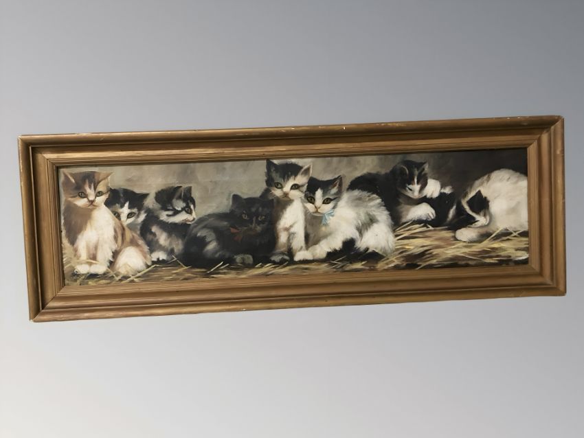 K Upton : Study of kittens on straw covered floor, oil on canvas, signed and dated 1917, 19 cm x 75 cm