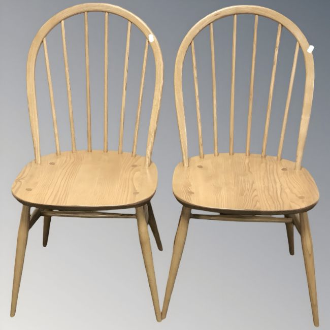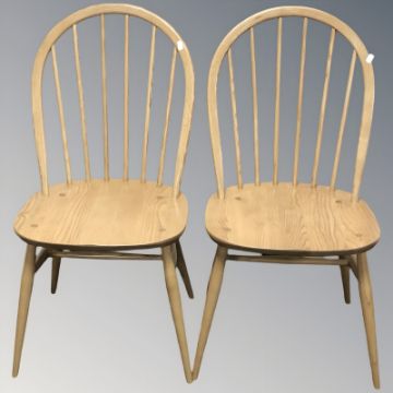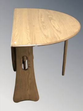 An Ercol light elm gate leg dining table, 120 cm L x 106 cm W x 72 cm H, together with a pair of Ercol elm and beech spindle back dining chairs.