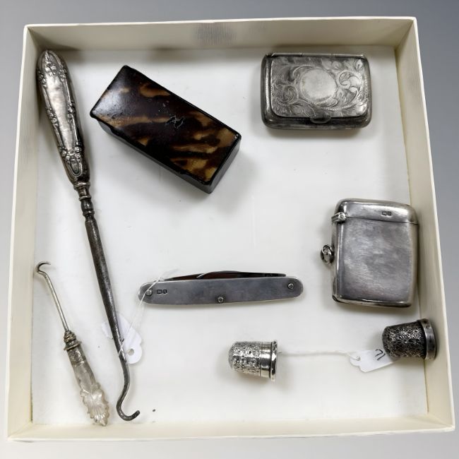 A silver vesta, similar folding knife, two thimbles, a plated snuff box, a horn snuff box and button hooks.