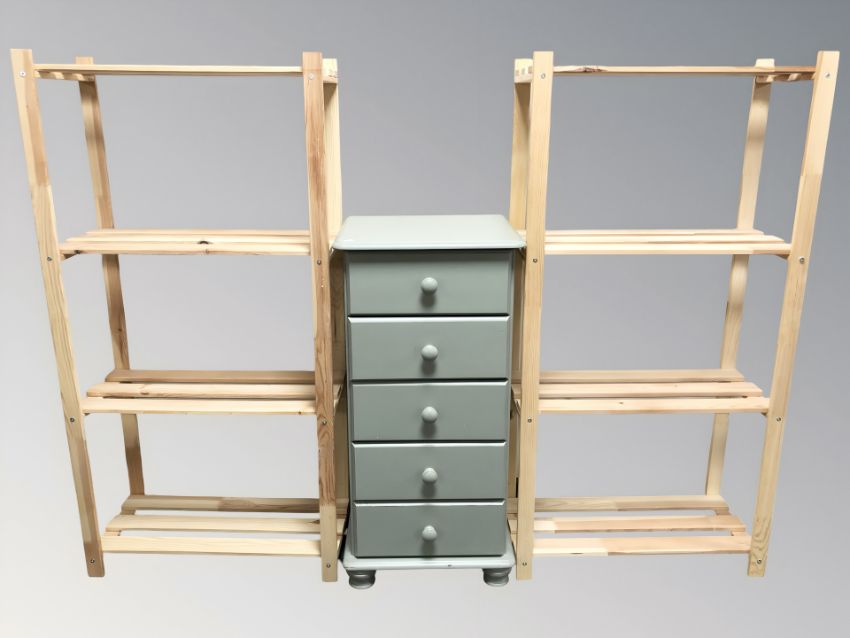 A painted pine five drawer chest, width 44 cm, and a pair of pine open shelves, each 65 cm W x 30 cm D x 130 cm H.