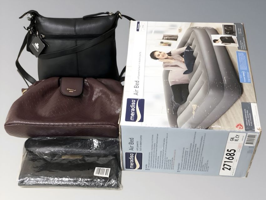 An air bed in box and a group of lady's hand bags. (1 box)