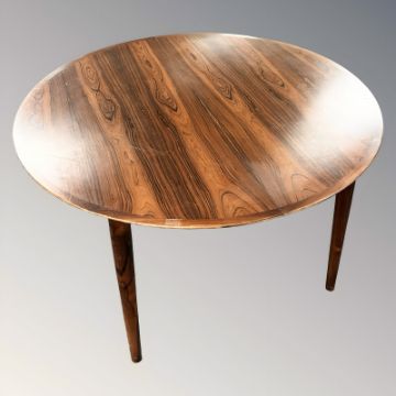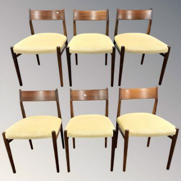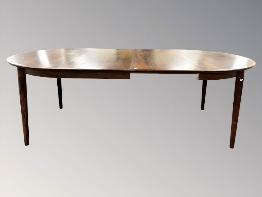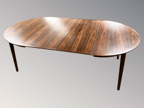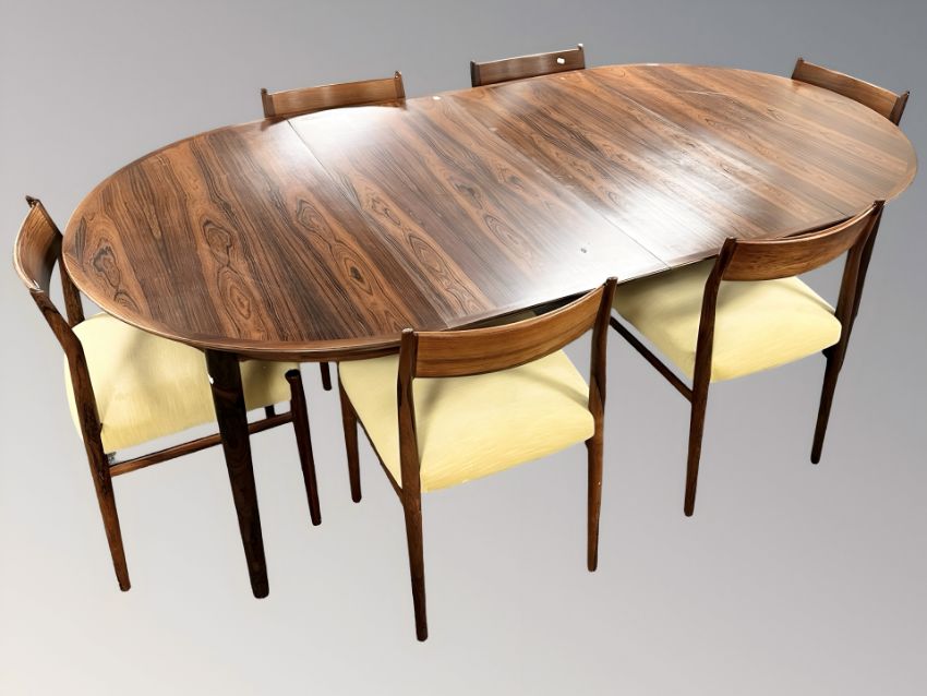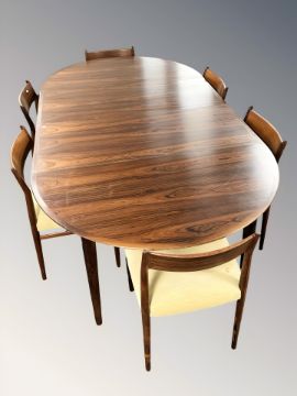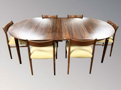 A Danish Arne Vodder for Sibast rosewood extending dining table with two leaves, total length 220 cm x width 120 cm x 72 cm, together with a set of six matching yellow dralon-upholstered dining chairs, each leaf 49.5 cm x 120 cm, chair height 79 cm. With CITES A10 certificate no. 25GBA1009BUL1