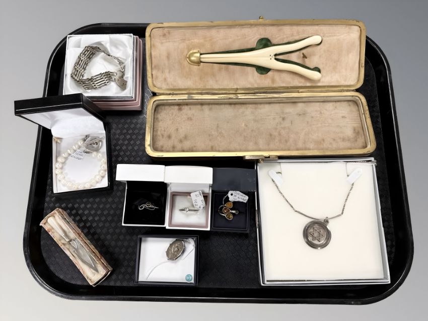 A group of silver jewellery, dress rings, padlock bracelet, pair of glove stretchers in fitted box, etc.