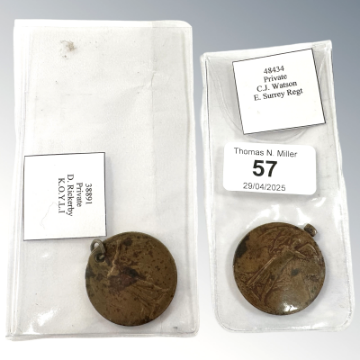 Two WWI Victory Medals; 38891 Pte D Rickerby King's Own Yorkshire Light Infantry, and 48434 Pte C J Watson East Surrey Regiment (2)
