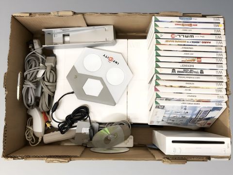 A Nintendo Wii, controllers, leads, various games, WiiFit board. (1 box)