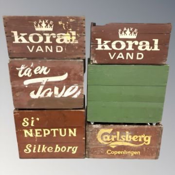 A group of painted pine bottle crates, largest 48 cm wide