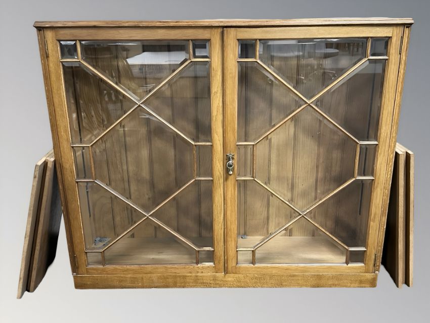 An early 20th century oak and bevelled glass double door book case, with shelved interior, 139 cm W x 32 cm D x 117 cm H.