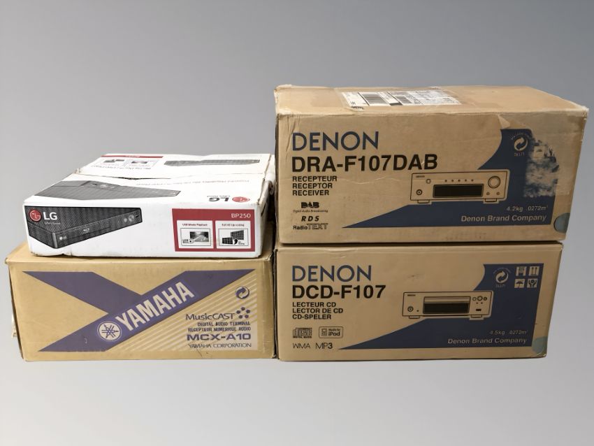 A Yamaha natural sound stereo tuner TX-492RDS, two boxed Denon receivers, a boxed LG Blu-Ray DVD player and a further boxed Yamaha MCX-A10 digital audio terminal.