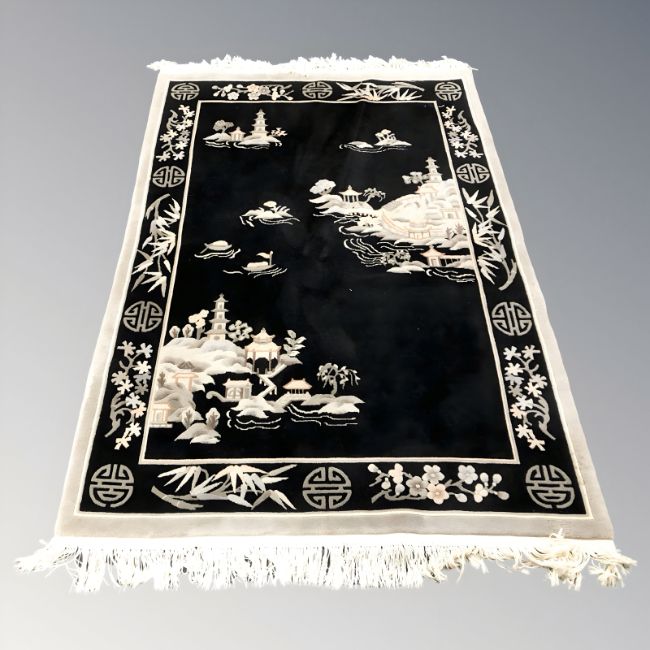 A Chinese rug on black ground, 222 cm x 140 cm.