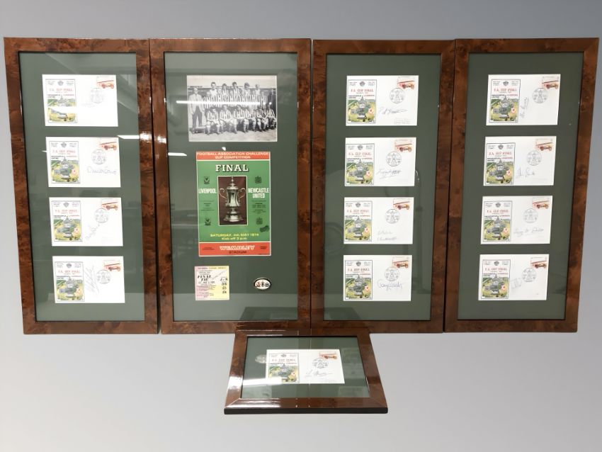 A group of framed montages of Newcastle United Vs Liverpool, Wembley 1974 FA cup final covers bearing various signatures, further match day programme, Liverpool ticket etc, largest frames 68 cm x 35 cm