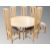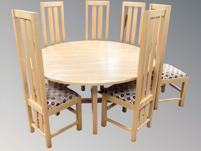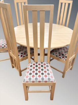 A good quality circular beech dining room table, diameter 150 cm, together with a set of six high backed dining chairs, upholstered in multi coloured circular patterned fabric.