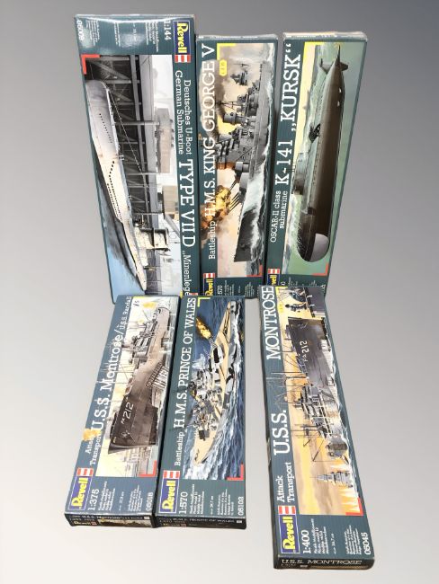 Six Revell scale model maritime / naval modelling kits, as illustrated