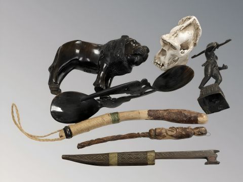A group of miscellaneous ethnic items including buffalo horn spoons, replica composition gorilla skull, figures, etc.