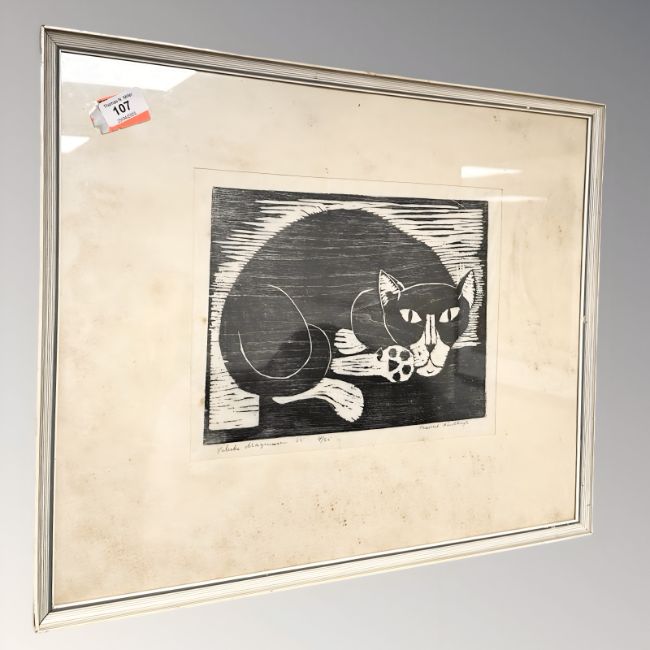 After V* Magnussen : Study of a cat, monochrome woodcut, signed in pencil and numbered 4/25, 34 cm x 26 cm.