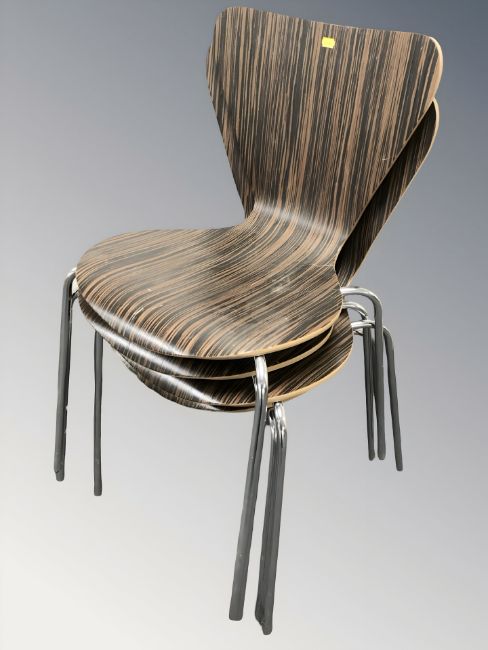 A set of four laminated wood and chrome dining chairs.
