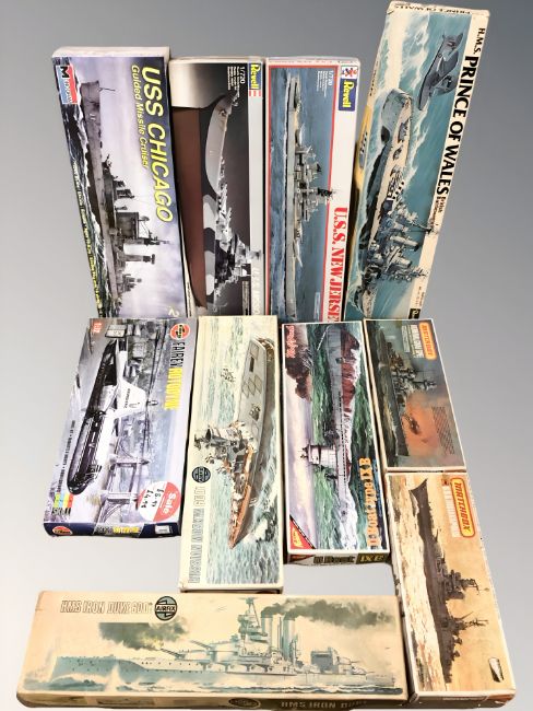A group of naval scale modelling kits including Revell, Airfix, Matchbox, etc. (1 box)