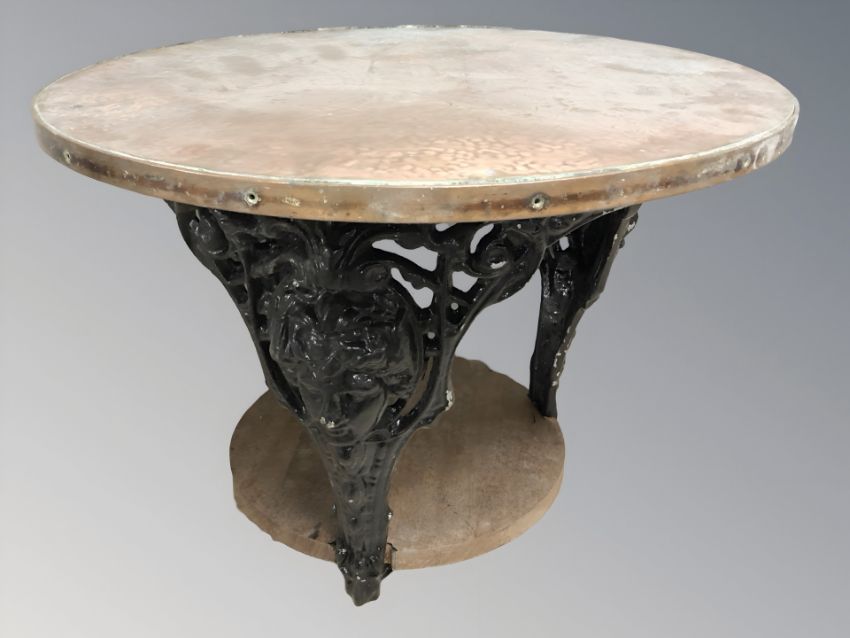 A cast iron and copper topped pub-style coffee table, diameter 57 cm.