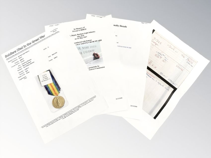 A WWI Victory Medal issued to 6-2474 Pte G. Ridge 6th Durham Light Infantry