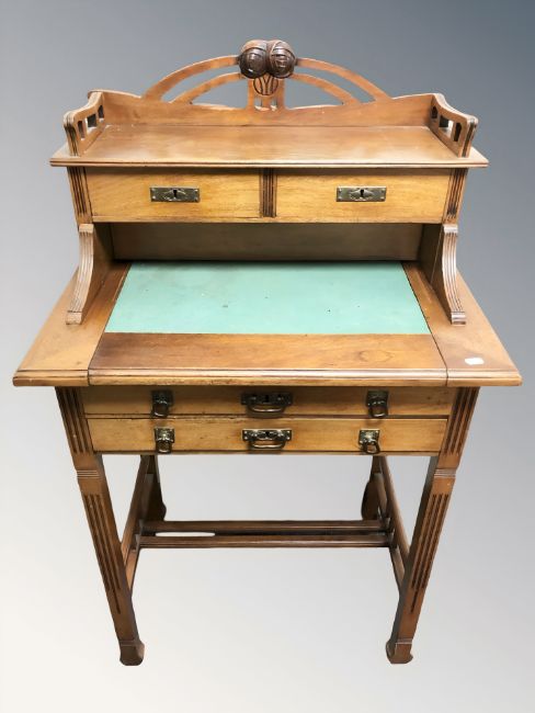 An Arts and Crafts style lady's mahogany writing desk, 70 cm W x 48 cm D x 115 cm H.