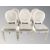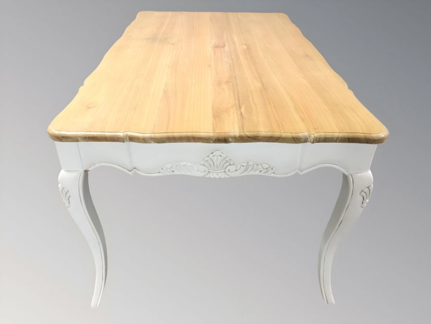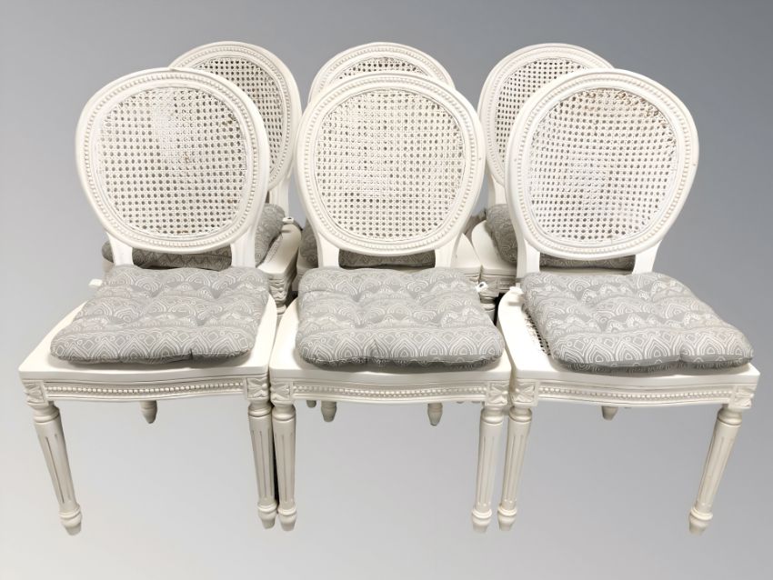 A French style painted pine dining table, 160 cm L x 94 cm W x 76 cm H, together with a set of six painted caned back dining chairs with cushions.